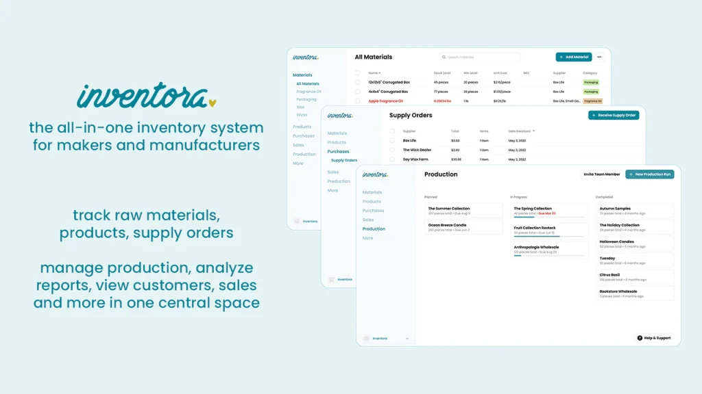 Inventora stands as a leader in handmade inventory management software, combining real-time raw material tracking, advanced production planning, accurate cost calculations, and seamless e-commerce integrations tailored specifically for soap, candle, and jewelry makers. Its user-friendly platform, flexible pricing, and industry-focused features provide everything a handmade business needs to scale efficiently and profitably. Choose Inventora to harness the power of precision inventory management and unlock your business’s full potential.